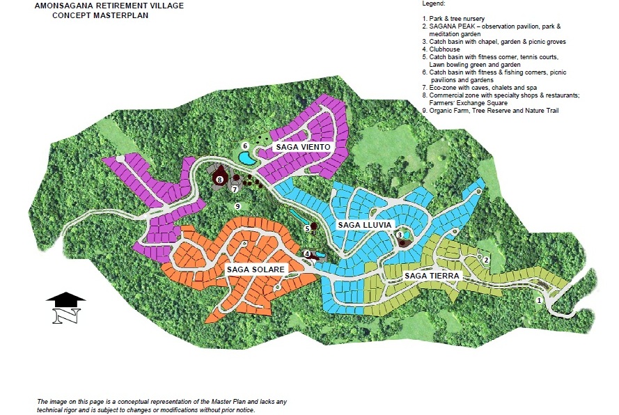 AMONSAGANA is master planned as a premier class retirement village development with layout and architectural designs emphasizing interaction between people in the community while safe-guarding open spaces and natural habitat. Covering an area of 32 hectares, AMONSAGANA will be developed in four phases, each being named to honor and celebrate one of the four elements. Each phase is designed as a private enclave of homes, connected yet distinct from one another. More than 40 percent of the land is dedicated to roads, parks, gardens, water catchment, organic farm, nature reserve and communal amenities. The infrastructure includes water, electricity, telephone, cable television and data supply lines as well as gated access and perimeter security. Eco-friendly concrete roads are built to maintain the hilly terrain yet designed with safety as a priority.