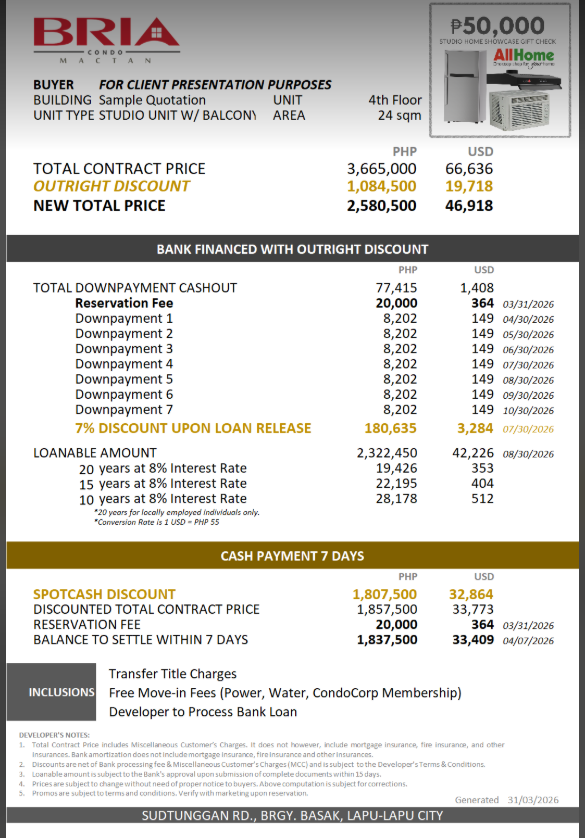 BRIA FLATS CONDOMINIUM – is a living in Mactan is reflected by Bria Flats’ nature-inspired terrain, yet near work hubs and major life destinations. Life is made easier for unit owners with its proximity to the soon-to-be built Mactan-Cordova Bridge that will connect Mactan to Shell Island to Cebu City.