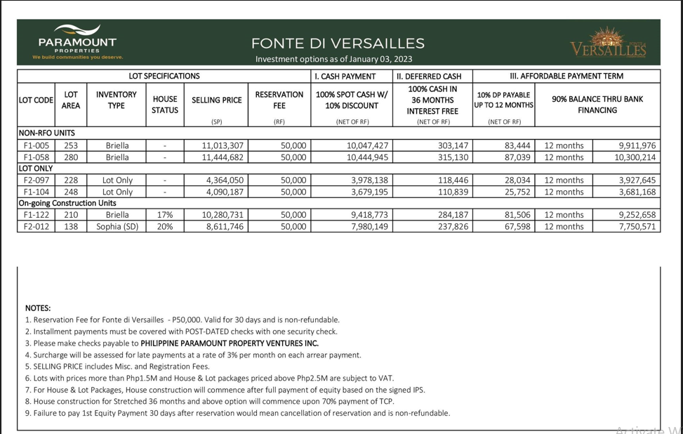 NOTE: Reservation Fee for Fonte Di Versailles – NORTH – P 10,000.00