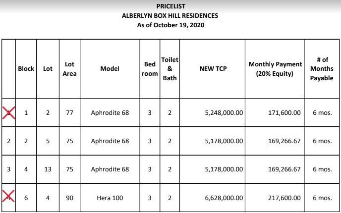 ALBERLYN BOX HILL RESIDENCES – ANNEX ( Price as of Sept. 26, 2019 )